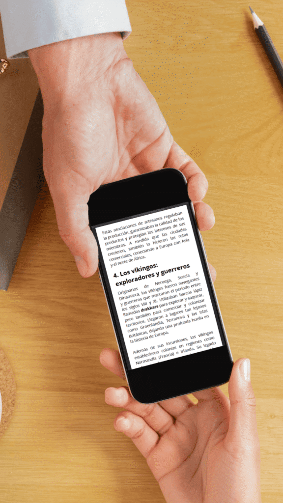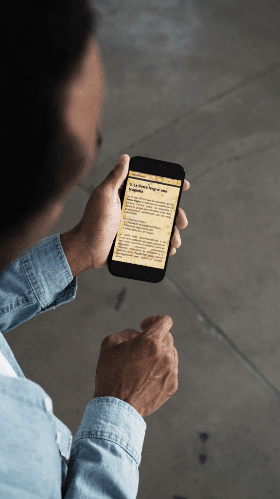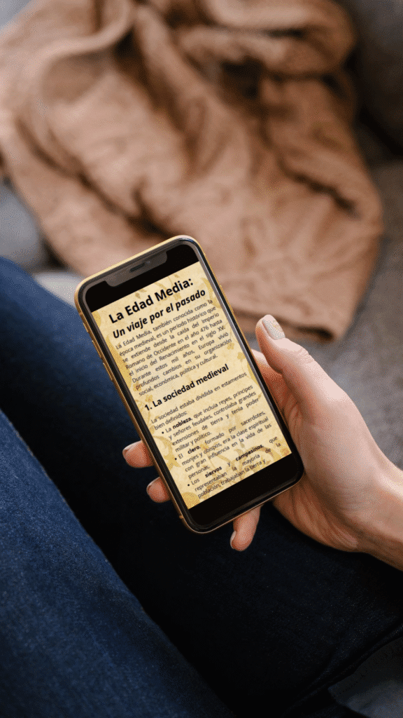 Este material de lectura sobre la Edad Media está diseñado especialmente para abrirse y leerse desde el teléfono móvil, lo que lo convierte en una herramienta ideal para los estudiantes de secundaria de hoy, que están acostumbrados a manejarse con el teléfono en el aula o en casa.